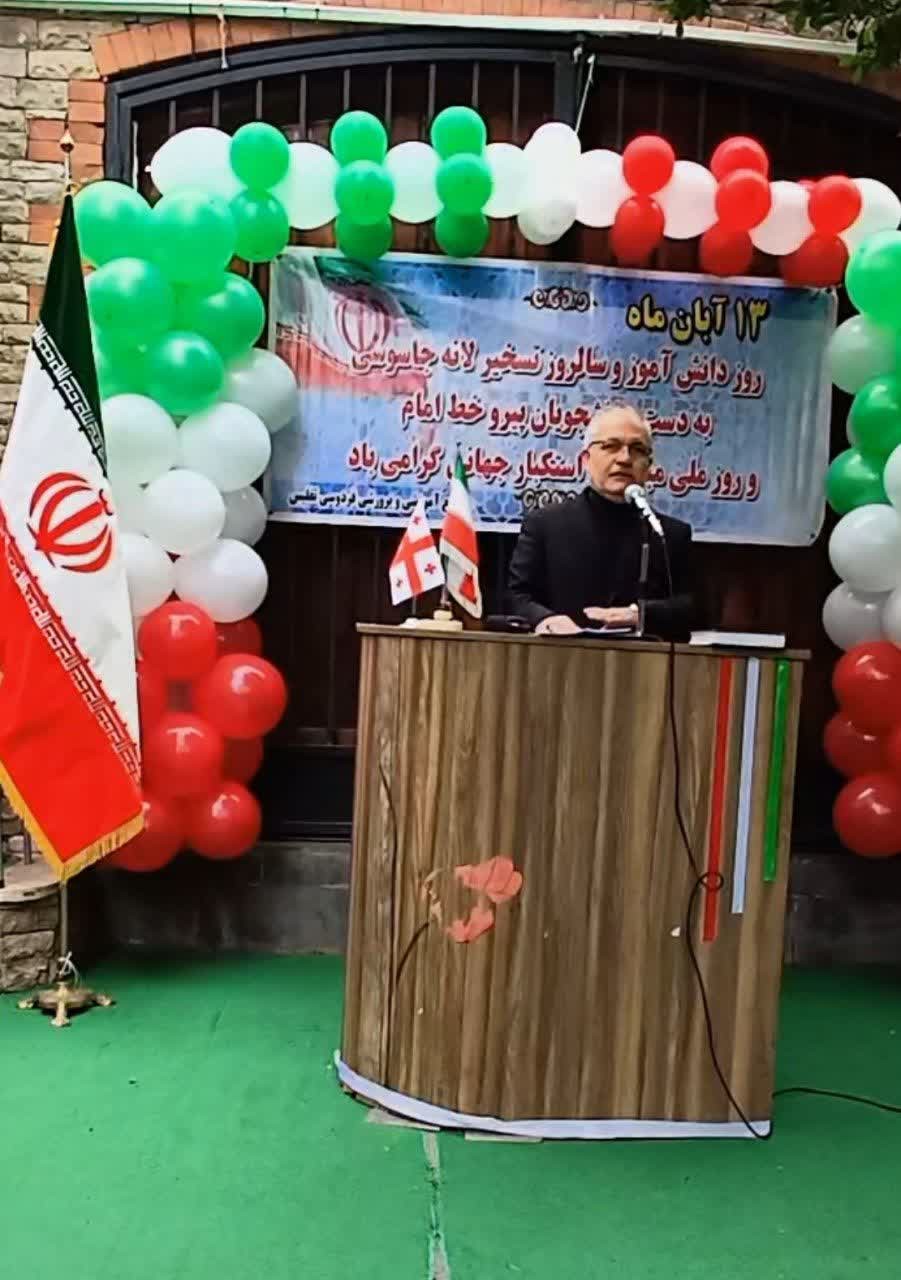 به مناسبت 13 آبان روز ملی مبارزه با استکبار جهانی، مراسم بزرگداشتی با حضور دانش آموزان ، معلمان، تنی چند از اولیای دانش آموزان ، سفیر و تعدادی از اعضای سفارت جهموری اسلامی ایران درگرجستان در مجتمع آموزشی فردوسی تفلیس برگزار شد. مراسم با تلاوت کلام الله مجید وپخش سرود ملی کشورعزیزمان آغاز شد