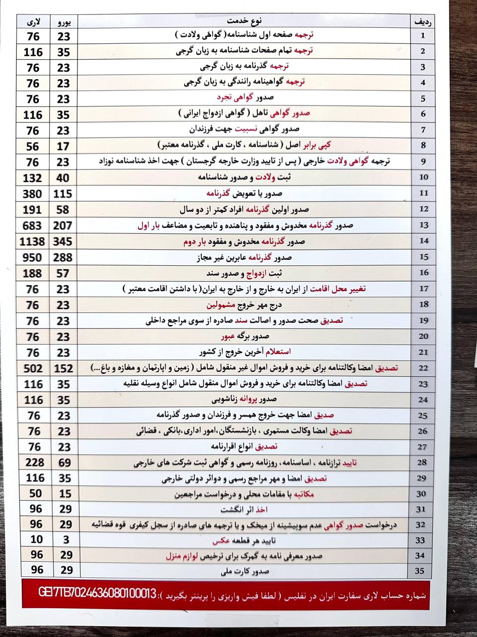 به اطلاع هموطنان گرامی می رساند: طبق جدول فوق الذکروبراساس تصویب نامه هیات محترم وزیران به شماره ۱۲۰۲۸۰ مورخ ۱۴۰۴/۰۷/۲۶، تعرفه خدمات کنسولی تغییر یافته است و خدمات کنسولی من بعد با نرخ جدید محاسبه و اعمال میگردد. لذا در مراجعه به بخش کنسولی و قبل از واریز هر وجهی از تعرفه جدید اطمینان حاصل نموده، سپس برابر نرخ های مصوب جدید اقدام به واریز وجه نمایید .