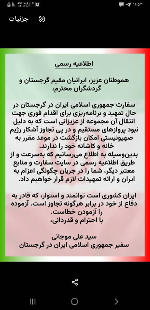 هموطنان عزیز، ایرانیان مقیم گرجستان و گردشگران محترم،